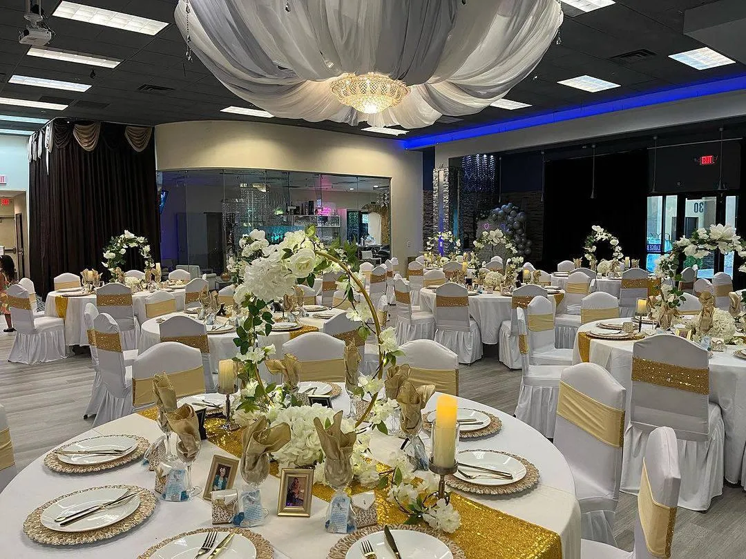 Our open space main reception hall comes with 5' round tables and banquet chairs with white or black covers, creating an elegant setting for any event.